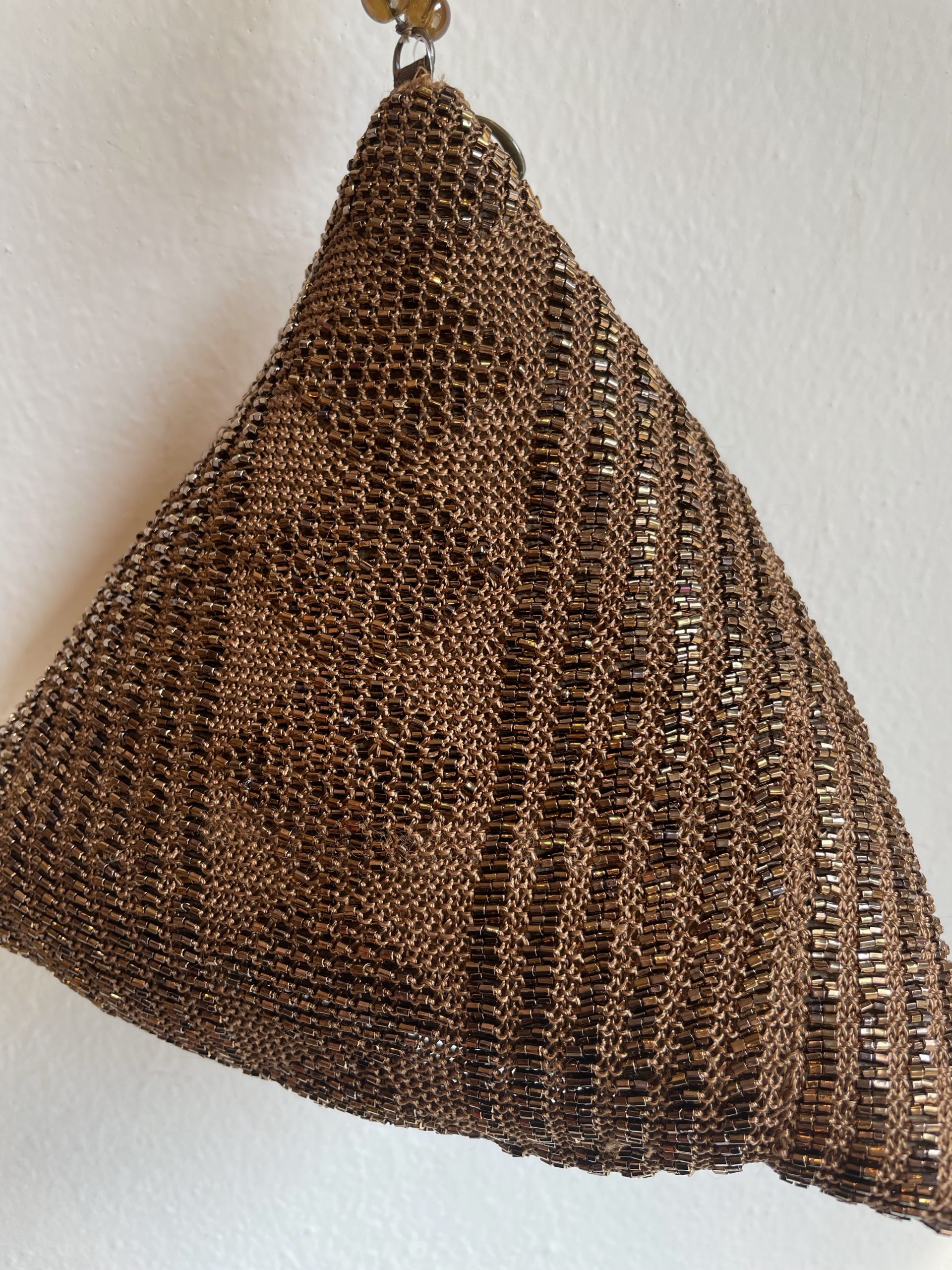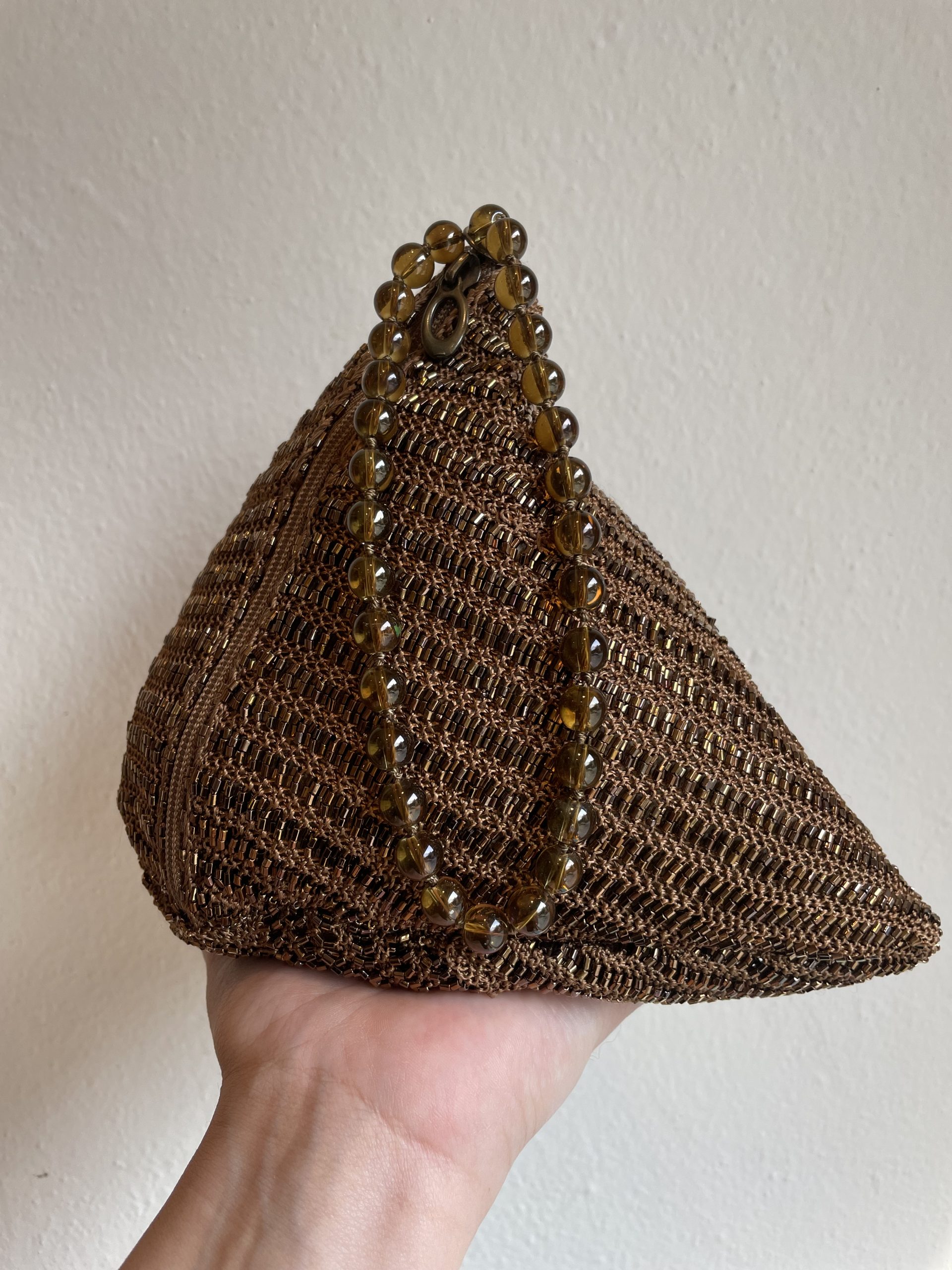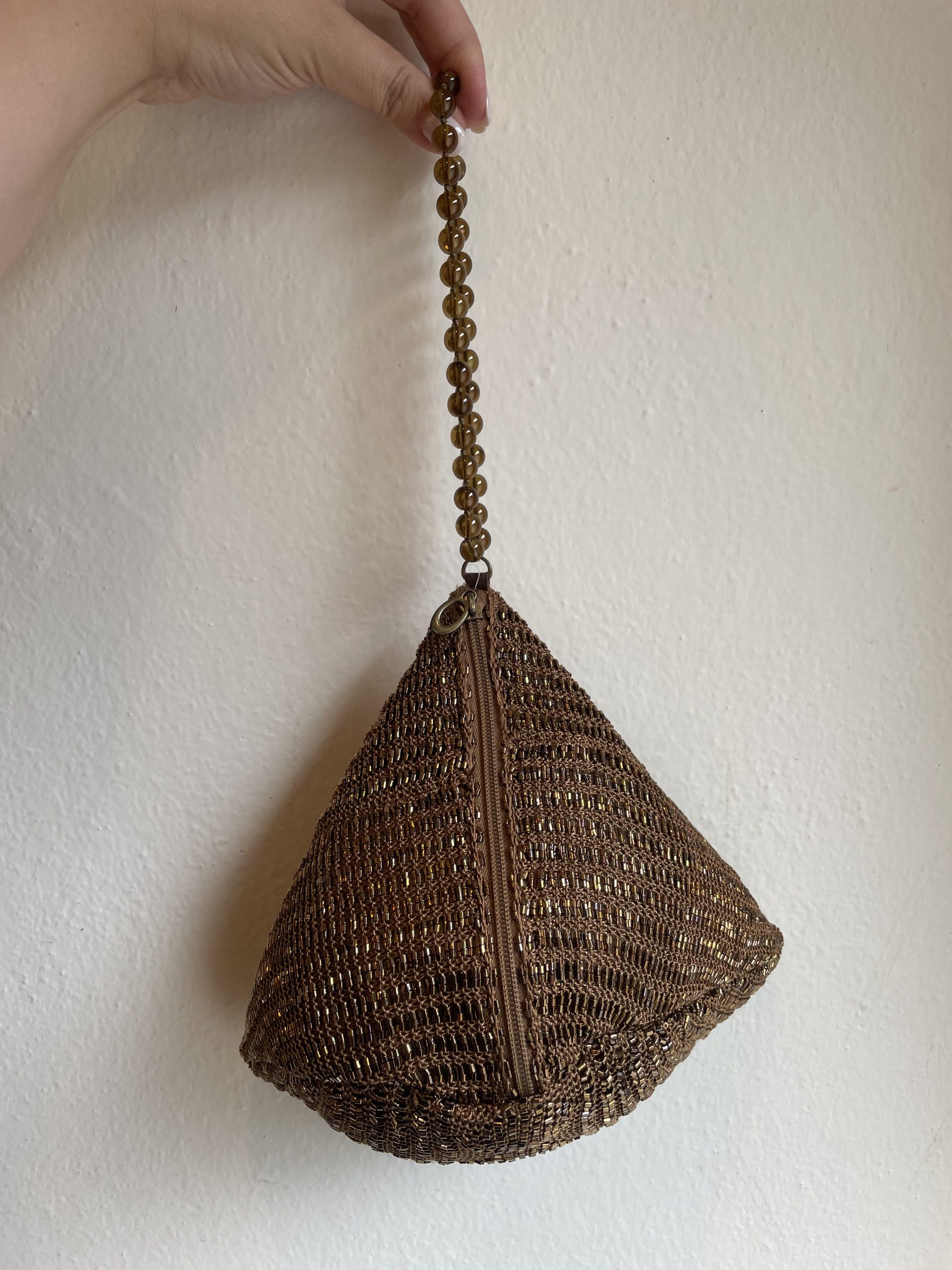 Borsa in tessuto satinato con perline, interno foderato, chiusura con cerniera e laccio da polso con pietre dure.