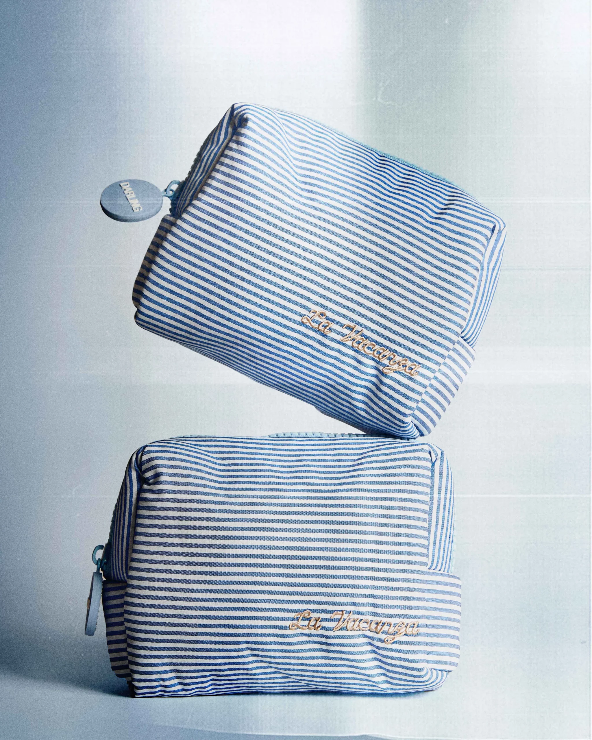 Una raffinata pouch a righe d’ispirazione italiana, con finiture premium, zip personalizzata e ricamo “La Vacanza”.
