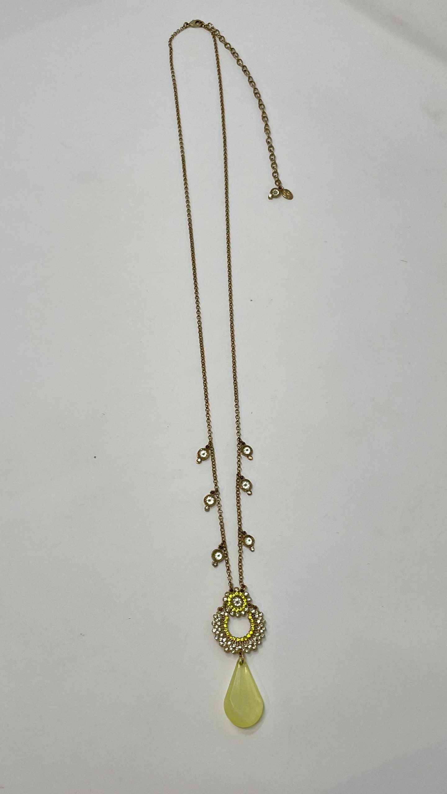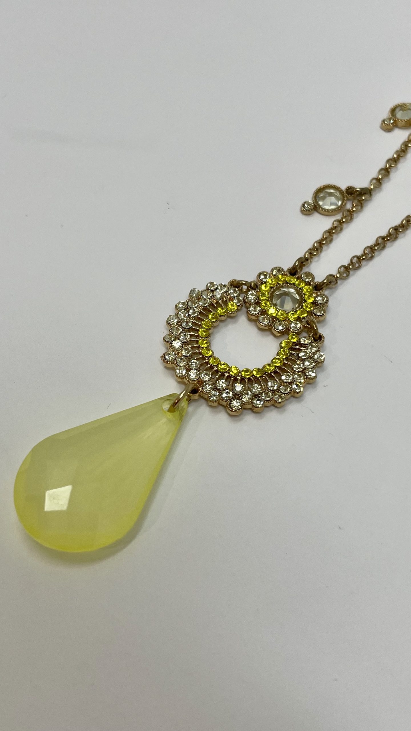 Collana in metallo anallergico placcato con cristalli Swarovski e goccia pendente in resina.