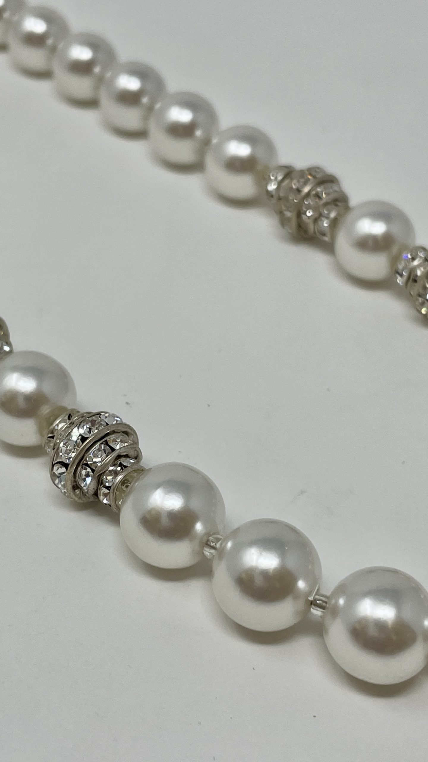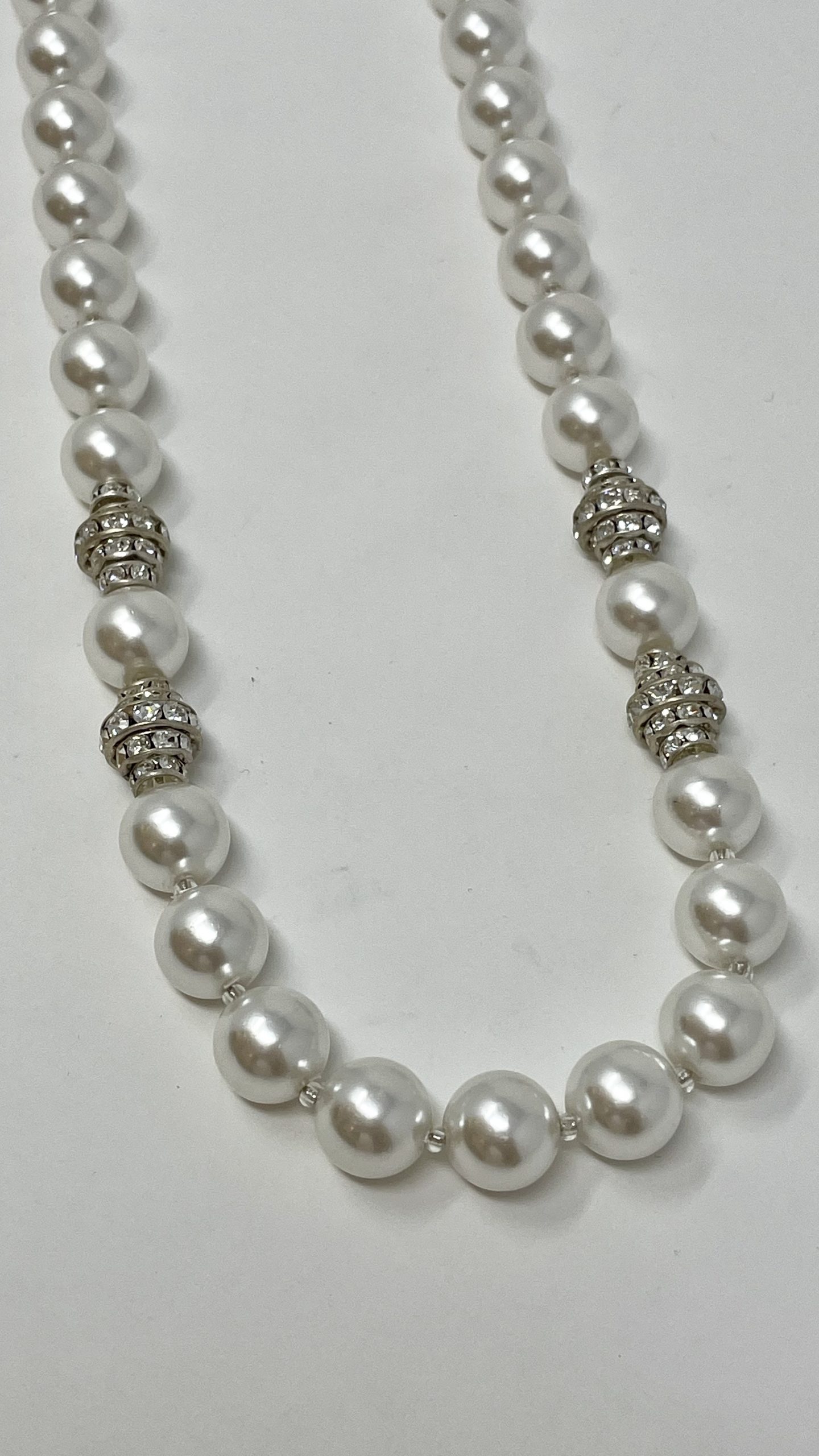 Collana con perle di bigiotteria, elementi in metallo anallergico con cristalli Swarovski e chiusura in metallo anallergico.